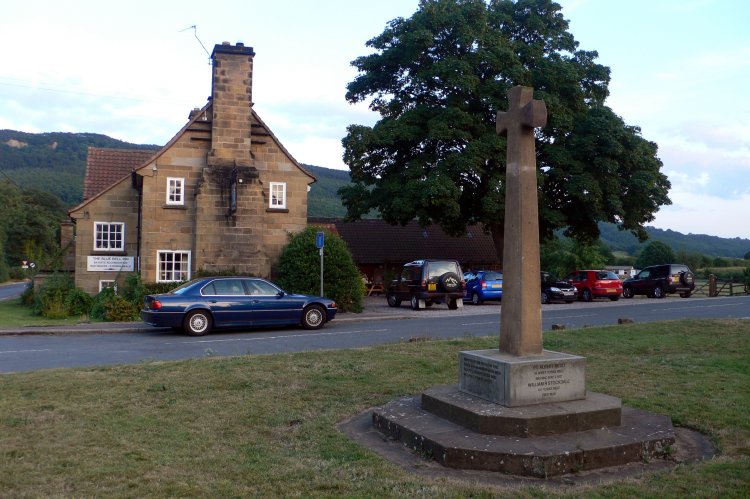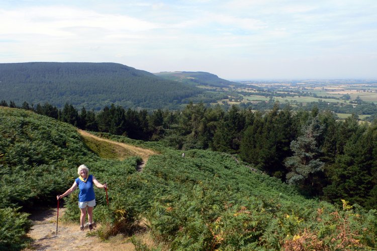 DAY 13 – a day of contrasts and Deb takes a tumble Saturday 29th July Ingleby Arncliffe to Blakey Ridge – 21 miles We woke at 6.30, dozed a little but were out of bed in time to get packed up before breakfast. From our bedroom window in the annex we saw the conservatory doors open on the dot of 7.45 a.m. A table for 4 was beautifully laid up with a whole row of homemade jams and marmalades in pots prettily topped with red and white checked fabric. Josephine soon appeared with a large loaf of homemade bread and invited us to sample the cereal and yoghurts from the side table, unfortunately the milk in the jug was well on its way to becoming yoghurt but it was soon replaced. We were joined by the two ladies from Milton Keynes and made polite conversation over a very large portion of scrambled eggs and smoked salmon. We finished with toast and some of the preserves but they were all much too sweet. We didn’t dare comment as Josephine was so proud of her produce. She did however make an excellent packed lunch complete with little extras such as sachets of salt and pepper and a few glacier mints. Oh dear, it sounds as if we are being very critical but Mum had been a home economics teacher and had occasionally been a judge for the W.I. so has very high standards. We were away by 8.30, past the Blue Bell again and on into Arncliffe Woods. Josephine was right, it was cooler – HURRAY! A gentle undulating climb on forestry tracks brought us to the edge of the wood where we doubled back to join the Cleveland Way. This would be our companion for the next 15 miles. At last the Cleveland Hills provided some contrast to the walking of the previous few days. There was certainly a lot more ascent and descent but the weather was much fresher and conditions were definitely more comfortable. As we reached our first summit, views of the Great Cleveland Plain opened up, we could see for miles – as far as Roseberry Topping – a funny pointed hill at the end of the moors looking like a punctuation mark. We walked passed a rather ugly radio and TV station and saw the trig point that marks the start of the Lyke Wake Walk. The route continued over moor land, through forestry and over some farmland. At a viewpoint on one of the forest trails, just past Scarth Nick, we nearly went wrong because the signpost mentioned in the guidebook was nowhere to be seen. We spotted our mistake just in time and descended into Scugdale then climbed back up over Carlton Bank. For the first time we experienced quite windy conditions but I suppose the stiff breeze explains why there is a glider station situated at this point on the moor. A steep descent followed down to a road and a slight detour brought us to the famous Lord Stones Café. It’s a good job the café was mentioned in our guidebook; it was completely invisible from the path. We ordered coffee at ate half our lunch in the company of one very noisy guinea fowl. We met up with the Dutch lads for the very last time and now regret that we never did ask them their names. Consulting our guidebook over lunch it described an easier route that traversed around the north side of Cringle Moor, Mum thought it prudent to go with this as we still had a long way to go. Unfortunately over the past few days Mum had been complaining of a stiff neck and shoulders. We concluded it was because she has to jut her chin forward in order to focus on her feet through the bifocal lenses in her glasses. As we were traversing along the wide path around Cringle Moor I suggested that she should try walking with her eyes focussed on the middle distance rather than on the ground, thinking that this might give her neck and shoulders a rest. Whilst demonstrating this principle I immediately tripped over my own feet and fell heavily onto my right knee. Once Mum realised that I was OK she was quick to point out that she would be declining to take any advice from her daughter on where she should place her focus! The versatile flannel came out of the pack and I scrubbed most of the grit and dirt out of my rather bloody knee and then refrained from offering any more advice. Our traversing path continued alongside the Broughton plantation to meet the road at Clay Bank Top but on spotting the Wainstones, high on the ridge to our right, I couldn’t resist nipping up to see the rocks. Being away from the crags of the Peak District I was missing the feeling of ‘hand on rock’ so I arranged with Mum to meet her at the road, ½ mile further along the route. I attempted to run up to the rocks but soon gave up and returned to a fast walk. I met some rock climbers on the top and took a few photos. Whilst descending, I spotted Mum on the lower track and had to run down the final section to catch up with her – not very comfortable whilst carrying a big pack. We met an elderly Gent on a seat just above Clay Bank Top; he gave us some encouragement about the route ahead whilst we changed our socks. No chance of a paddle today! The climb onto Urra Moor was steep at first but then eased as we kept a lookout for the ancient marker stones. We spotted several including the Hand Stone and the Face Stone. At one point Mum shouted too look up and I was just quick enough to photograph a large aeroplane flying low above our heads. It was making a low droning sound as it slowly passed overhead, we thought it might have been a Lancaster Bomber as it reminded us of the Damn Busters film but I’m sure someone with more aeronautical knowledge will let us know if we were wrong. We were aiming to reach Bloworth Crossing on the former Rosedale Railway by 5 p.m. This would give us 2 hours to complete the final 5 miles and get to the Lion Inn by 7.00. We reached the crossing 15 minutes early so treated ourselves to a brief sit down and we finished off the sandwiches. By now it was much cooler, and over the next two hours it even threatened to rain a couple of times. It never did rain and the final 5 miles were walked on a sli