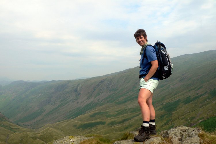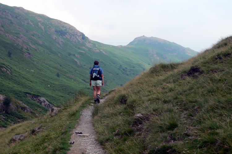 DAY 4 – Helm Crag beckoned but will have to wait for another day Thursday 20th July Stonethwaite to Grasmere – 8 miles Woke at 6 a.m. to a very strange sound – RAIN! A very welcome change but it proved to be short lived and without much of a cooling effect. We ate a delicious breakfast – grapefruit, apricots and prunes followed by a very tasty cooked breakfast and then toast and homemade preserves. We chatted to Tracy, a young woman from Seattle, doing the C2C on her own as two of her companions had backed out. Somehow we got a lesson in the Washington State and Federal tax systems – it’s amazing what you learn on a 192 mile walk. We left Knotts View with our packed lunches and happy hearts. Mum was feeling much more optimistic now. She was wearing a pair of my ‘smartwool’ walking socks and Anne had assured her that things would improve or maybe it was just the damp start to the day. It continued to drizzle as we walked up the left side of the valley but it brought no complaints from either of us. As we began the slow plod up towards Greenup Edge the rain eased and Mum put her waterproof back in the sack. We met a small group of bedraggled youngsters completing their Gold Duke of Edinburgh award. They had started their day at 2.30 a.m. trying to avoid the heat of the previous days; 10 minutes later we met their accompanying adult who was still cursing their choice of start time. Apparently he had to keep the group in sight but without being seen himself. Half way up the climb we were overtaken by Henny and Albert and then caught by Tracy. She relayed to us her amusing experiences in the valley. As she left Knotts View she was met by a herd of sheep in the lane, the farmer thought she was in charge of a group of kids who were messing about, scattering the sheep in all directions throughout the tiny village. Tracy gave a convincing impression of the irate farmer banging his stick on the ground and shouting “WHEN A MAN IS MOVING HIS SHEEP, YOU GET OUT OF THE WAY”. I hope this is not the only impression she gets of the Lakeland farmers. After passing Eagle crag we reached an unexpected corrie only to see Lining Crag looming above us with no alternative but to ascend it. Slowly but surely we climbed up to Greenup Edge and used the GPS for the first time to locate the head of Far Easedale as it was a touch misty and the path was not very clear. We ate lunch at the head of the valley and phoned home to discover that Mum’s sister, Aunty Judy, had gone into hospital to have a pacemaker fitted. Our lofty position seemed to highlight the contrast – one sister walking 192 miles, the other having a heart related operation. I fancied taking the route over Helm Crag but Mum didn’t want to chance her luck and anyway we needed to reach Grasmere in time to purchase some new socks – my smartwool socks were proving to be a great success, Mum’s feet were much more comfortable. Helm Crag will just have to wait for another day. The route down was gentle but it got very hot again near the bottom as the sun finally emerged from the overcast sky. We treated ourselves to an ice cream as we neared Grasmere then did our sock shopping and bought groceries for tea tonight. It felt strange to be amongst tourists pottering about between art galleries and tea rooms and dodging the tour buses parked along side the road. With a bottle of wine and provisions for dinner in the pack the 1 ½ mile plod to Broadrayne Farm was a bit further than we wanted but the extra mileage was well worth it. We got superb views of tomorrow’s route and the independent hostel at the farm was fantastic. We were met by Bev and his delightful 3 year old daughter Anya. Mums rucksack was waiting for us as usual but it had a strange carrier bag tied onto it. On investigating, we discovered it contained a plug-in electric fan. Had some kind person sent us a gift? Still puzzled we phoned Sherpa Van who explained that it must have fallen off someone else’s luggage and delivered to us my mistake. We were told to leave it with our pack the following morning and the owner would surely claim it. This we did but later heard that no one ever claimed the fan and it still resides in the Sherpa Van lost property cupboard in Richmond. Bev and Anya showed us to our room which was a 6 bed dorm. We had the room and its own en-suite facilities to ourselves. We made use of the washing machine (£2) and cooked supper in the well equipped kitchen. Corn on the cob, Salmon & new potatoes, then strawberries and cherries for desert all washed down with ¾ of a bottle of Pinot Grigio. The hostel is an eco-friendly converted barn and provides everything you could possibly need. It was one of the nicest hostels I have stayed in; I’ve certainly logged it in my memory for future use. We had another early night, despite our relatively short day tomorrow. Thought for the day: